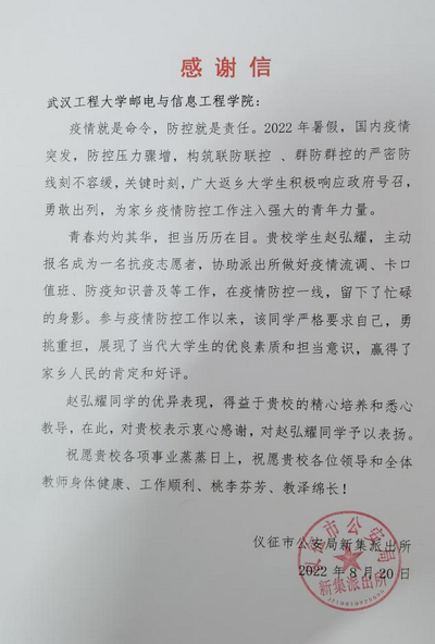 赵弘耀,20级自动化01班学生,入党积极分子,自2022年6月20日至2022年8月23日在江苏省扬州市仪征市公安局新集派出所协助民警工作,主要是从事疫情流调、卡口值班、防疫知识普及等工作。参与基层工作以来,该同学严格要求自己,勇挑重担,展现了当代大学生的优良素质和担当意识,贏得了家乡人民的肯定和好评。