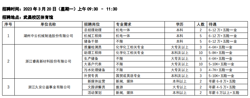 2023年3月20日浙江省湖州市南浔区专场招聘会岗位信息一览表