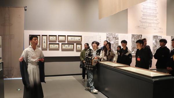 主题团课结束后,全体师生来到中国建筑科技馆,开展红色科普文化传承一体化实践活动。在古代建筑展厅和荆楚建筑展厅中,青马班学员杨思思、刘梓恒身着汉服进行讲解,师生沉浸式感受中国传统建筑文化,见证了古代能工巧匠的智慧。