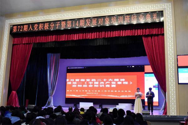 本次知识竞赛由中共武汉工程大学邮电与信息工程学院委员会党校主办,围绕《中国共产党章程》,组织党校培训班学员参与学习和竞赛,提升了入党积极分子、发展对象学员的理论水平。参赛队伍们信心满满,斗志昂扬,展现了学院入党积极分子、发展对象培训班学员蓬勃向上的精神风貌。(审稿人:文婷)