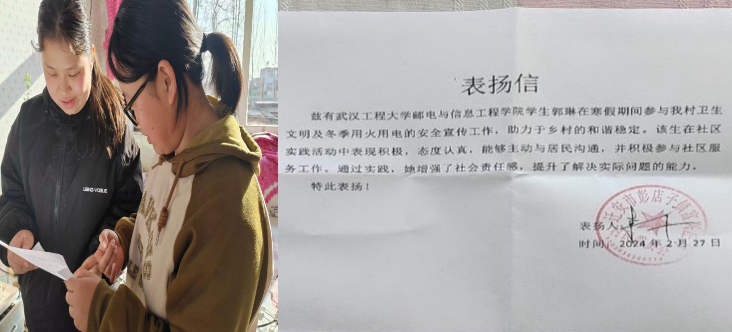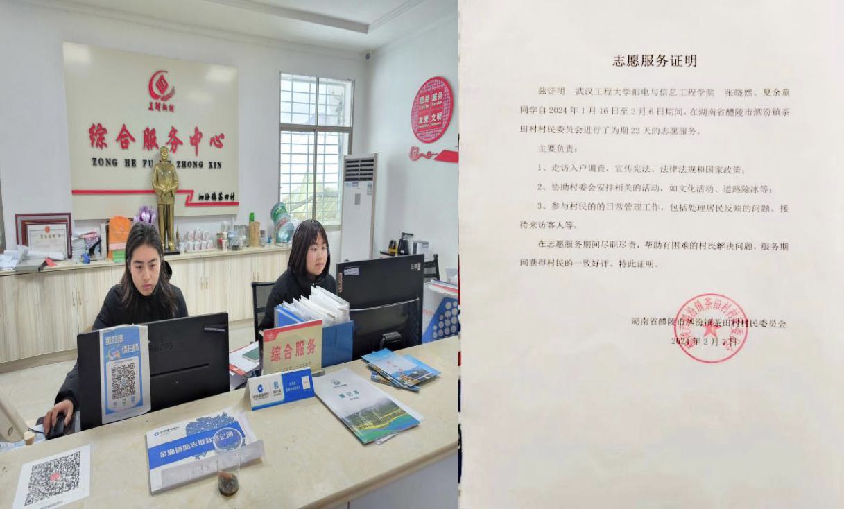 2024年1月16日至2月6日,第五党支部学生党员张晓然、夏余童服务于湖南省株洲市醴陵市泗汾镇茶田村村民委员会。她们走访入户调查,负责宣传法律法规及国家政策,并协助村委会参与村民日常管理工作。服务期间,她们踏实肯干、认真负责,获得村委会和村民们的一致好评。
