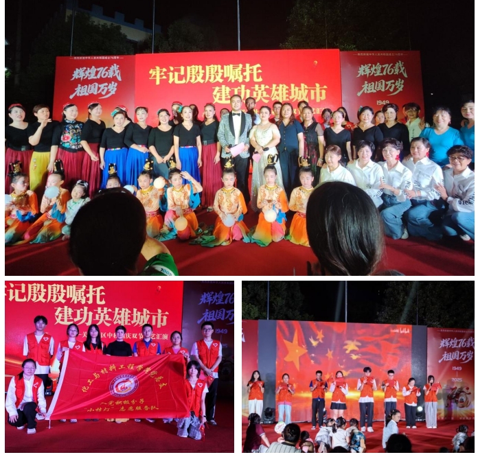 9月28日晚上,学生党员队伍也应邀参与卓刀泉街道办关西社区举办的“牢记殷殷嘱托,建功英雄城市”迎中秋、庆国庆文艺汇演活动。汇演节目精彩纷呈,涵盖舞蹈、合唱、太极拳、情景剧、诗词朗诵等多种形式。由化工与材料工程学院“追光”党员理论宣讲团带来的朗诵节目《月满华夏·礼赞家国》,情感真挚、气势恢宏,赢得了现场观众的阵阵掌声,展现出我校学子良好的精神风貌与爱国情怀。