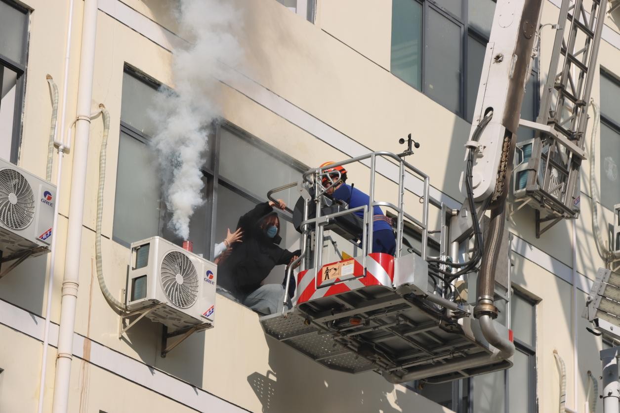 紧接着,关山消防救援站进行模拟逃生演练。消防员通过云梯将被困学生安全救援到达指定位置。