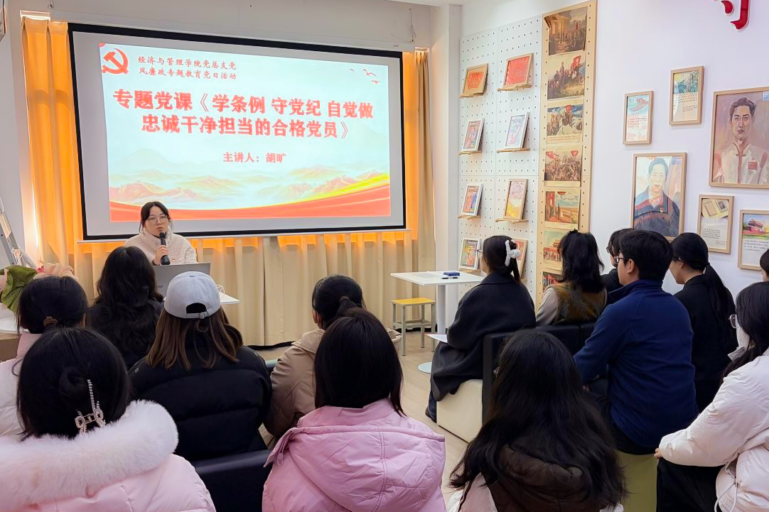 经济与管理学院党总支书记胡旷以《学条例 守党纪 自觉做忠诚干净担当的合格党员》为题讲授专题党课。她带领全体党员深入学习《中国共产党纪律处分条例》,系统阐述党的纪律规矩的核心要义与时代要求,强调要准确把握“六项纪律”,将党纪学习教育融入日常、抓在经常,切实增强政治定力、纪律定力、道德定力、抵腐定力,真正将遵规守纪内化为日常习惯和行动准绳。