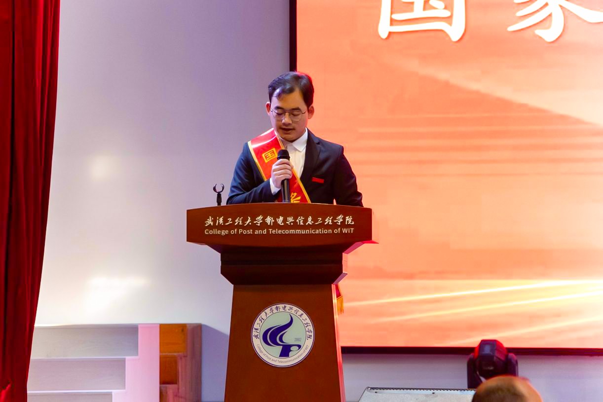 会上,优秀班主任代表于金金老师、国家奖学金获奖者2023级电气工程及其自动化03班华维杰、优良学风班班长2024级英语02班方芳分别作为代表上台发言。