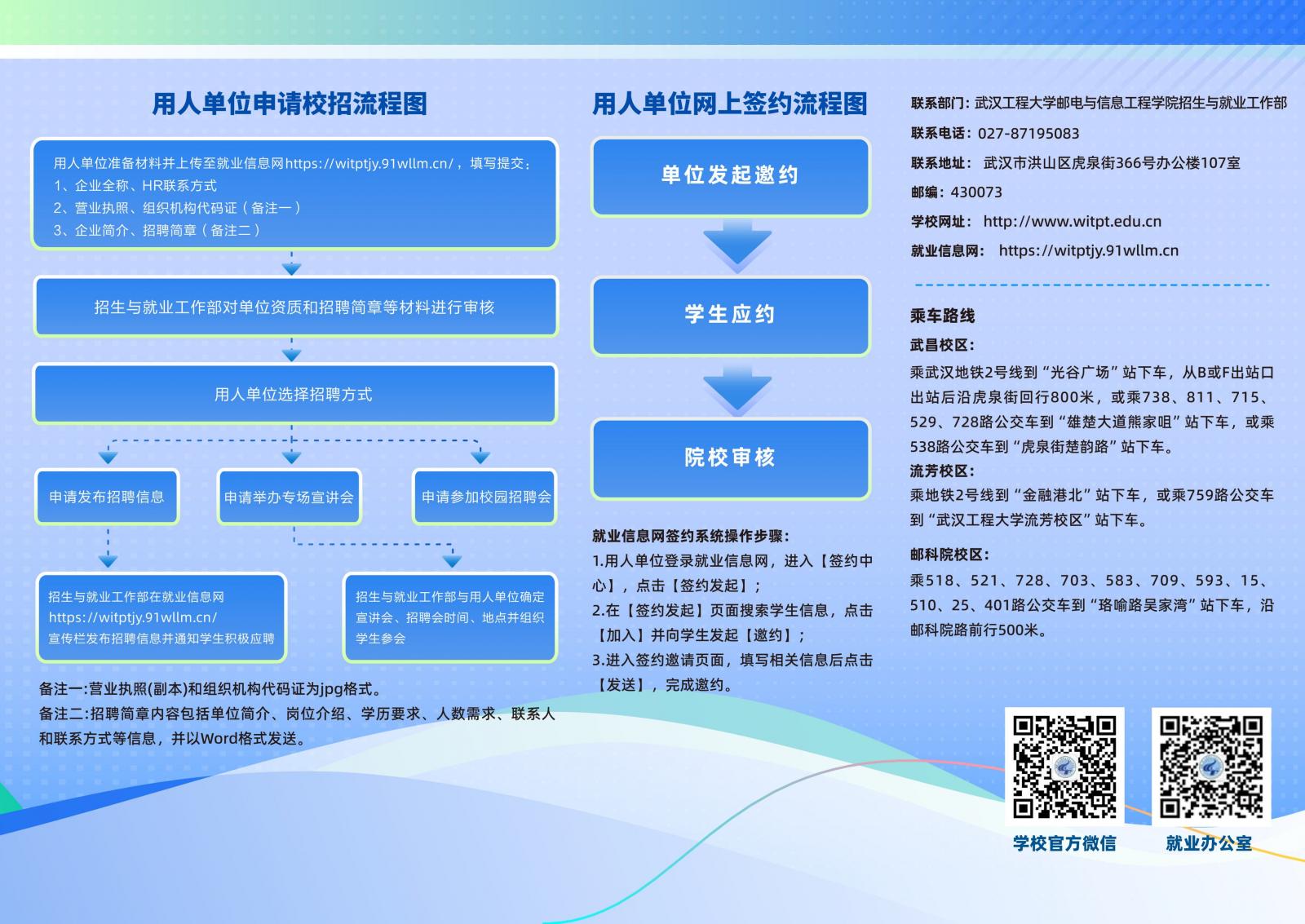 根据学院教学安排,2026年寒假时间为1月19日至2月28日,3月1日正式开学。为充分搭建用人单位和毕业生交流平台,促进毕业生更充分更高质量就业,积极稳妥组织好校园招聘活动,我校定于2026年3月25日举办2026年“湖北百校联动”高校毕业生供需见面活动暨武汉工程大学邮电与信息工程学院春季专场招聘会。在此,我们诚挚邀请各用人单位入校广纳贤才。现将招聘会有关事项说明如下: