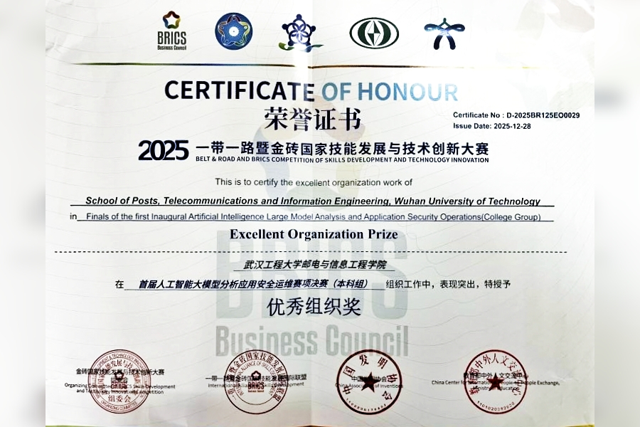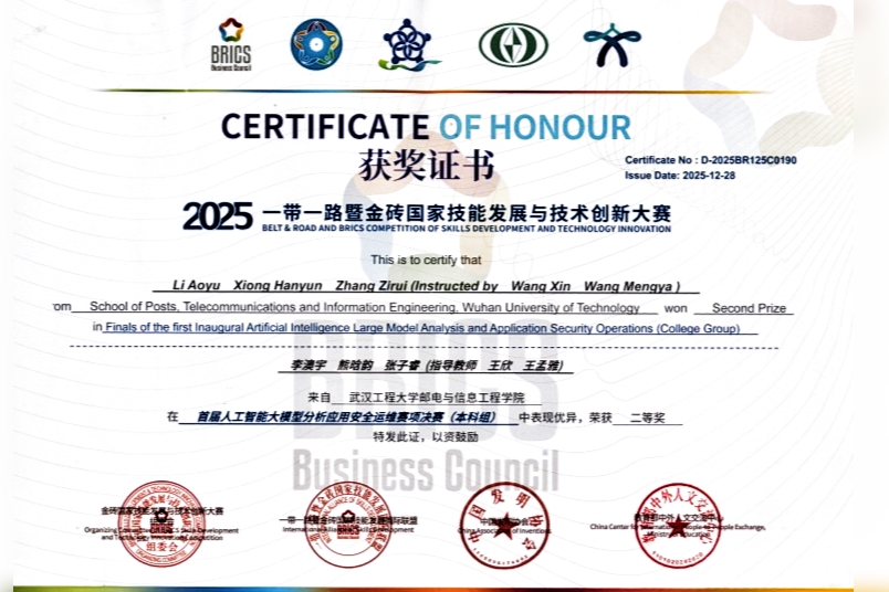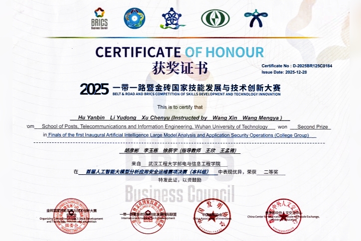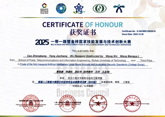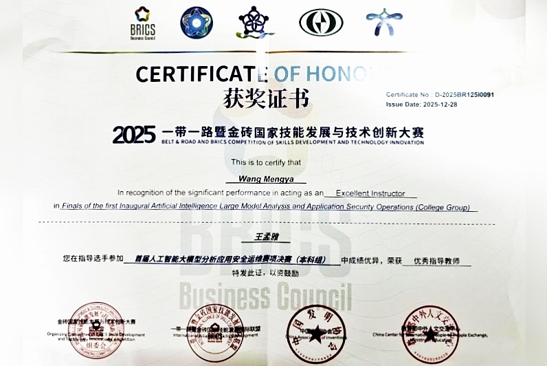 (通讯员:曹政康 王孟雅 王欣)2025年12月25日,“一带一路” 暨金砖国家技能发展与技术创新大赛首届人工智能大模型分析应用安全运维国际总决赛在广西南宁圆满落幕。作为教育部认定的A类国际职业技能赛事,本届大赛聚焦人工智能大模型前沿技术应用与安全运维核心能力,吸引国内外126支高校精英队伍同台竞技,赛事规格高、专业性强、竞争激烈。