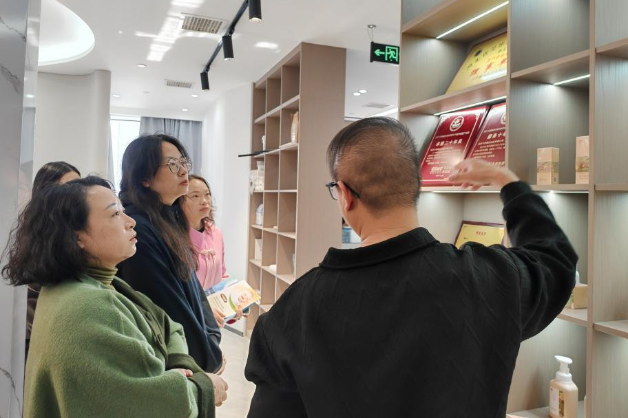 在企业相关负责人陪同下,经济与管理学院一行实地考察了企业研发中心、品牌展示中心,深入了解企业在美妆护肤领域的技术创新、产品研发及市场运营等情况。
