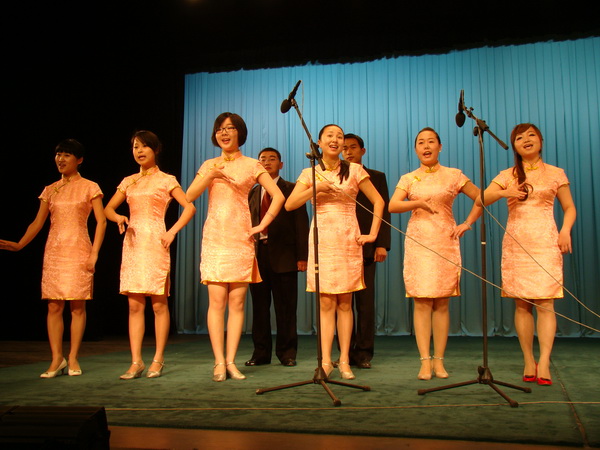 舞台上群星荟萃,一派梨园盛景。我院由姚裕安老师及张万茹同学等10余人组成的代表队压轴出场。在姚裕安、刘士贵老师的伴奏下,表演了一出集合《红灯记》、《龙江颂》、《智取威虎山》三部优秀作品的现代京剧联唱。在众多代表队中,我院是唯一一支服装整齐统一的队伍,他们扮相端庄大气,唱腔委婉动人,板眼有秩,张弛有度,熟悉的韵律、优美的唱词令在场的观众赞不绝口,掌声雷动。