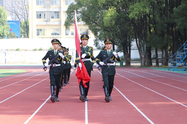 武汉工程大学副校长、学院董事长张文学代表学院向新生军训团授旗。