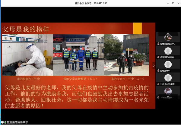 分享会上,经济与管理系17级法学01班侯栋焱、机械与电气工程系19级计科05班陈子洋、化工与材料工程系19级兴发01班杨茂林、邮科院校区17级通信工程04班吴沁泽、经济与管理系19级法学03班盛立豪五名抗疫志愿者代表分享了“抗疫”期间的难忘经历和感受,表示青年一代应该承担的社会责任,危难时刻要展示出新时代青年的担当作为,努力成为有理想、有本领、有担当的时代新人。
