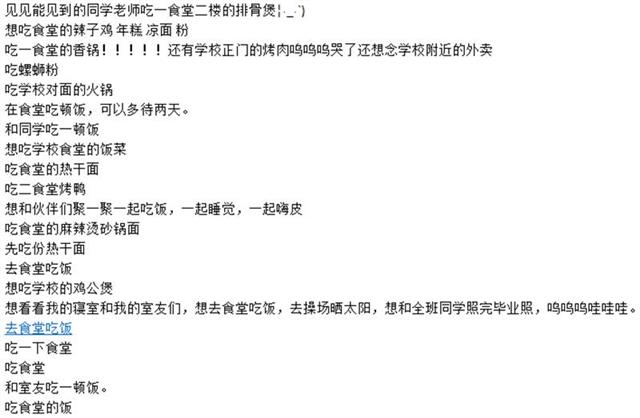 记者整理发现,与“吃”有关的留言最多,共400余条,学校食堂的热干面、排骨煲、香锅、辣子鸡、黄焖鸡、砂锅面等都被学生们深深惦记,有人说“想给食堂阿姨一个拥抱”,而更难忘的,是曾和他们一起吃饭、happy的那些人;希望在校园各处拍照的同学有360多人,其中盼望拍毕业照的有198人,有人伤感地说“学校欠我们一个毕业典礼和我们穿上学士服的毕业照”;提到“同学”“室友”的有300多人,他们希望和同学见面,拥抱、聚餐、拍毕业照,甚至想和同学一起在校园举办演唱会;200多人想当面对老师说谢谢;不少人也提到了“武汉”,他们说:“非常想念武汉,希望能再看看这个城市”“最想在校园每一个地方逛一逛,操场上躺着看看武汉的天空”“花千把块去武汉,我要住几天,一天不够”。