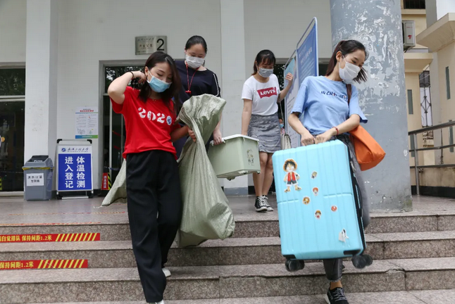 宿舍楼内,处处可见师生一起忙碌的身影。收拾物品,打包行李,大家一边忙碌着劳动一边聊家常。老师们总是忍不住多唠叨几句,多叮咛几声,装进去的是行李,放不下的却是老师的牵挂。
