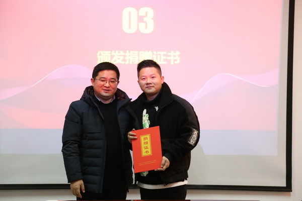 捐赠仪式上,学院党政办公室主任聂海滨、产与后勤管理部部长卢勇,机械与电气工程学院党总支书记李承亮、经济与管理学院党总支书记禹涛作为代表接受爱心口罩的捐赠。学院院长助理、学生工作部部长田文明向总经理丁毅颁发了捐赠证书。