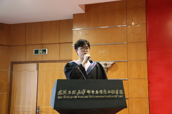 礼乐响起,210名毕业生在歌声中依次上台接受授位,武汉工程大学邮电与信息工程学院院长韩高军教授,艺术设计学院院长宋奕勤教授为毕业生拨穗授位,毕业生们向老师致以感谢。